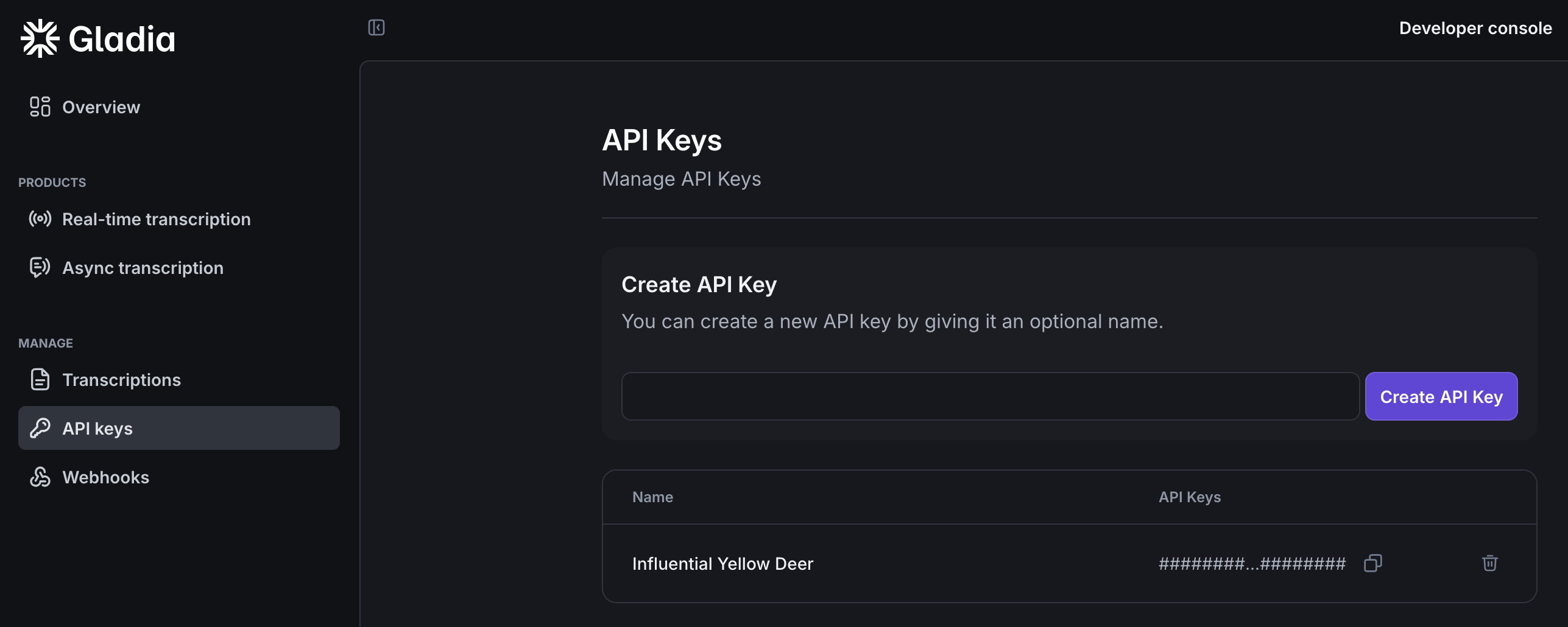 Now that you signed up, login to app.gladia.io and go to the API keys section. We should have already created a default key for you. You can use this one or create your own.